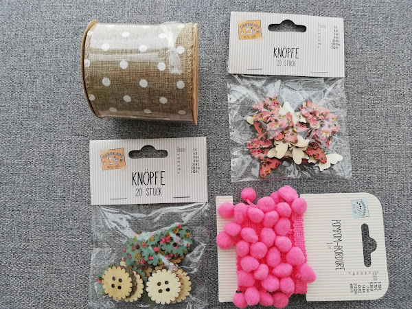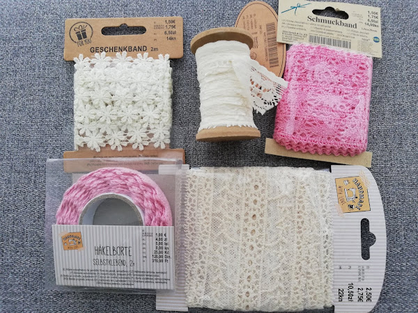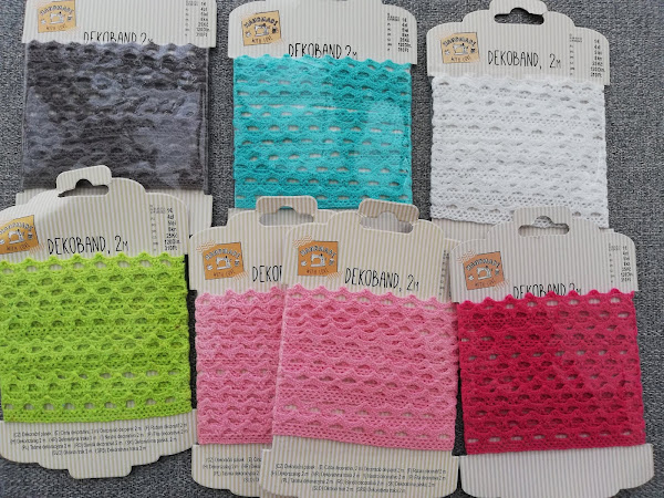 Cinta decorativa en diferentes colores (en total 7: gris, azul, blanco, verde, rosa claro y rosa) de 2 metros de largo y 100% algodón a 1 € cada una.