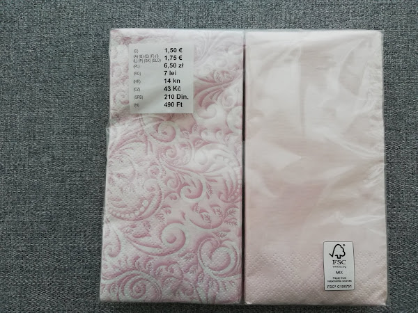 Servilletas en tonos rosas, vienen 20 servilletas de 3 capas de 33 cm x 33 cm, con un precio de 1,75 €.