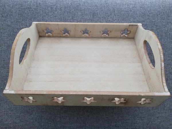 Bandeja de madera con estrellas en los laterales de 22 cm (medidas reales 22,5 cm x 16 cm) parece pintada a la tiza dejando entrever la veta de la madera por debajo, tiene un precio de 3.50 €.