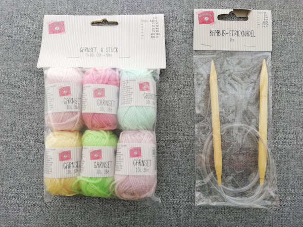 Kit de 6 lanas 100% poliacrílicas, en madejas de 10 gr en los colores: 2 verdes, 3 rosas y amarillo. Con un precio de 3,50 €.