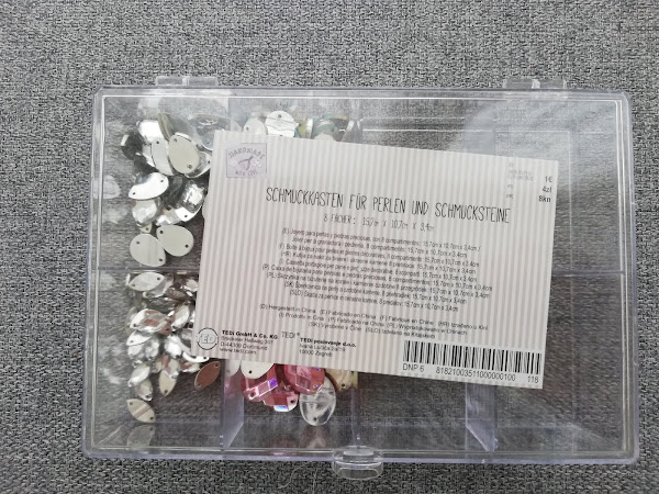 Caja de plástico transparente con 8 compartimentos de 15,7 cm x 10,7 x 3,4 cm, con un precio de 1 €. La caja viene bacía.