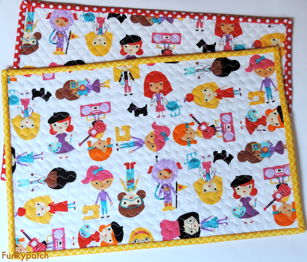 Y por ultimo un divertido encargo de 2 manteles individuales estos también con una tela de Anne Kelle. No me digáis que la niña astronauta nos es una monada con su traje lila?
