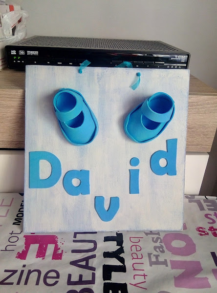 El cartelito es de madera pintado con los tonos de colores, y lijados, los zapatitos y el nombre está hechos en goma eva y para colgarlo he puesto una cinta azul muy mona.