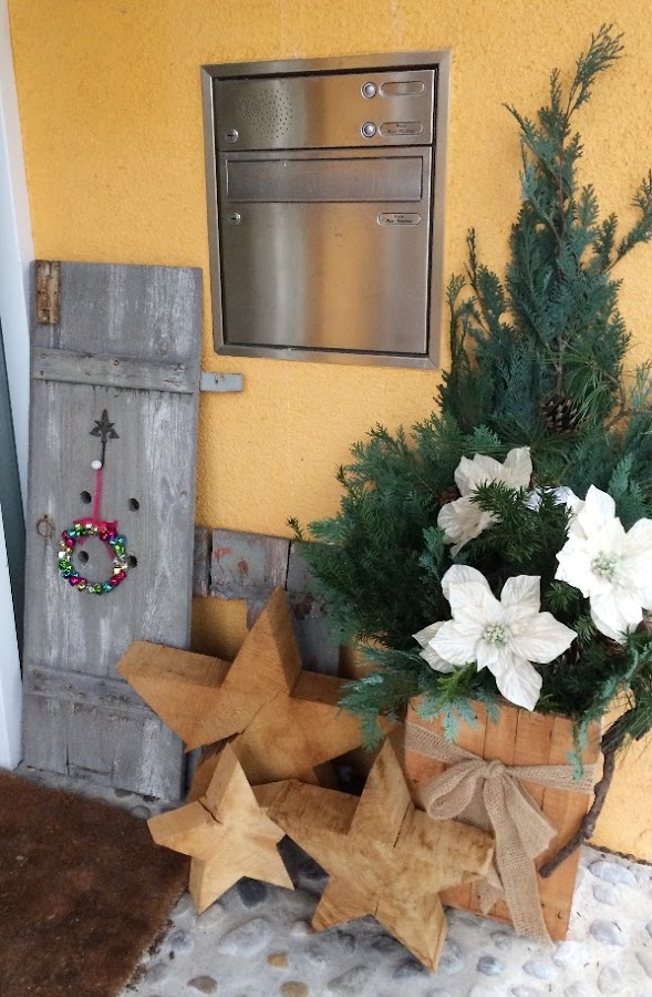 Dentro le coloqué un balde con agua para que mis ramas queden frescas por más tiempo, y un poco más de decoración, y así está la entrada de la casa.