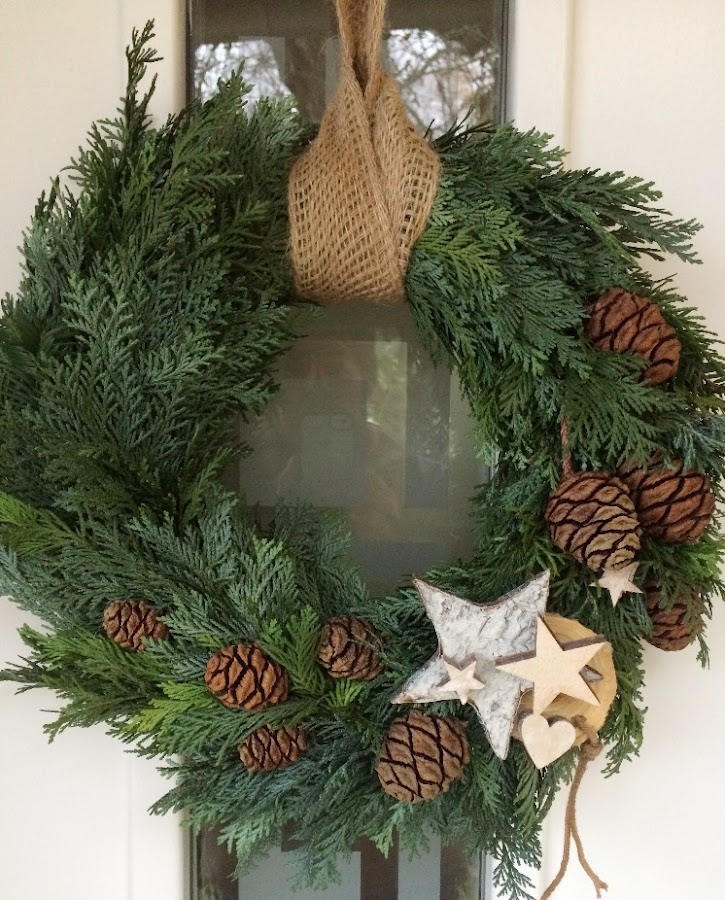 Con esta corona muy simple, sólo verde y poco más. Estas "piñas" son de secuoyas, las recogimos cuando fuimos de picnic al "bosque de secuoyas" en el zoológico Wilhelma. Si vienes a Stuttgart no te lo puedes perder! (Aquí te dejo un enlace para ir a ver el parque ahora antes de la navidad, las secuoyas se convierten en el bosque encantado de Aladino!)