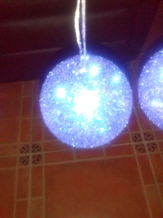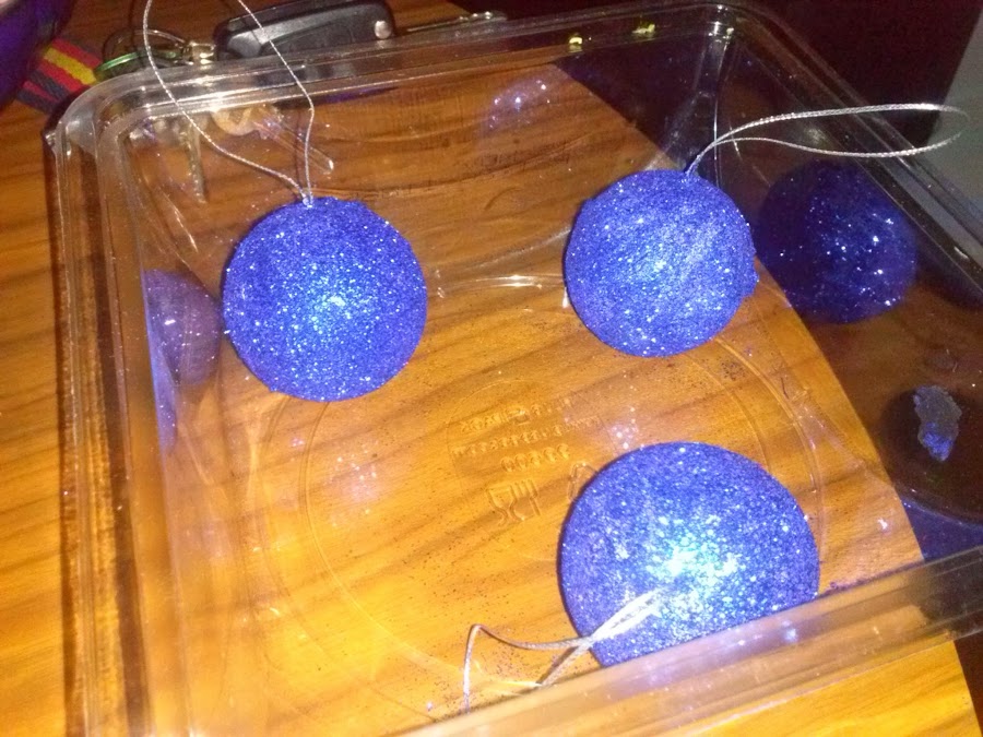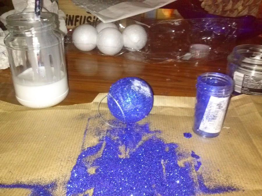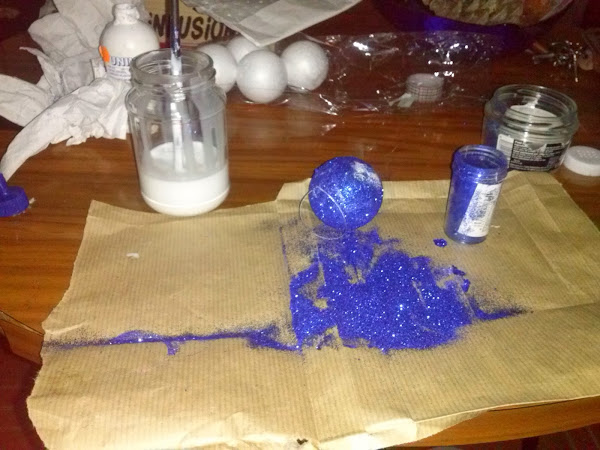 Introducir la bola de corcho en cola o untar, he ir salpicando la purpurina por todas la bola hasta que quede uniforme. Ponerlas ha secar, varias horas.