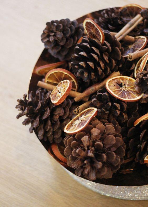 Y si no sabes dónde puedes colgar el DIY anterior, no te preocupes, con las mismas naranjas hornéalas junto con unas ramitas de canela y añade unas piñas al cesto, crearás un centro de mesa que además de decorar y dar un toque especial, dejará un olor increíble allá donde lo coloques