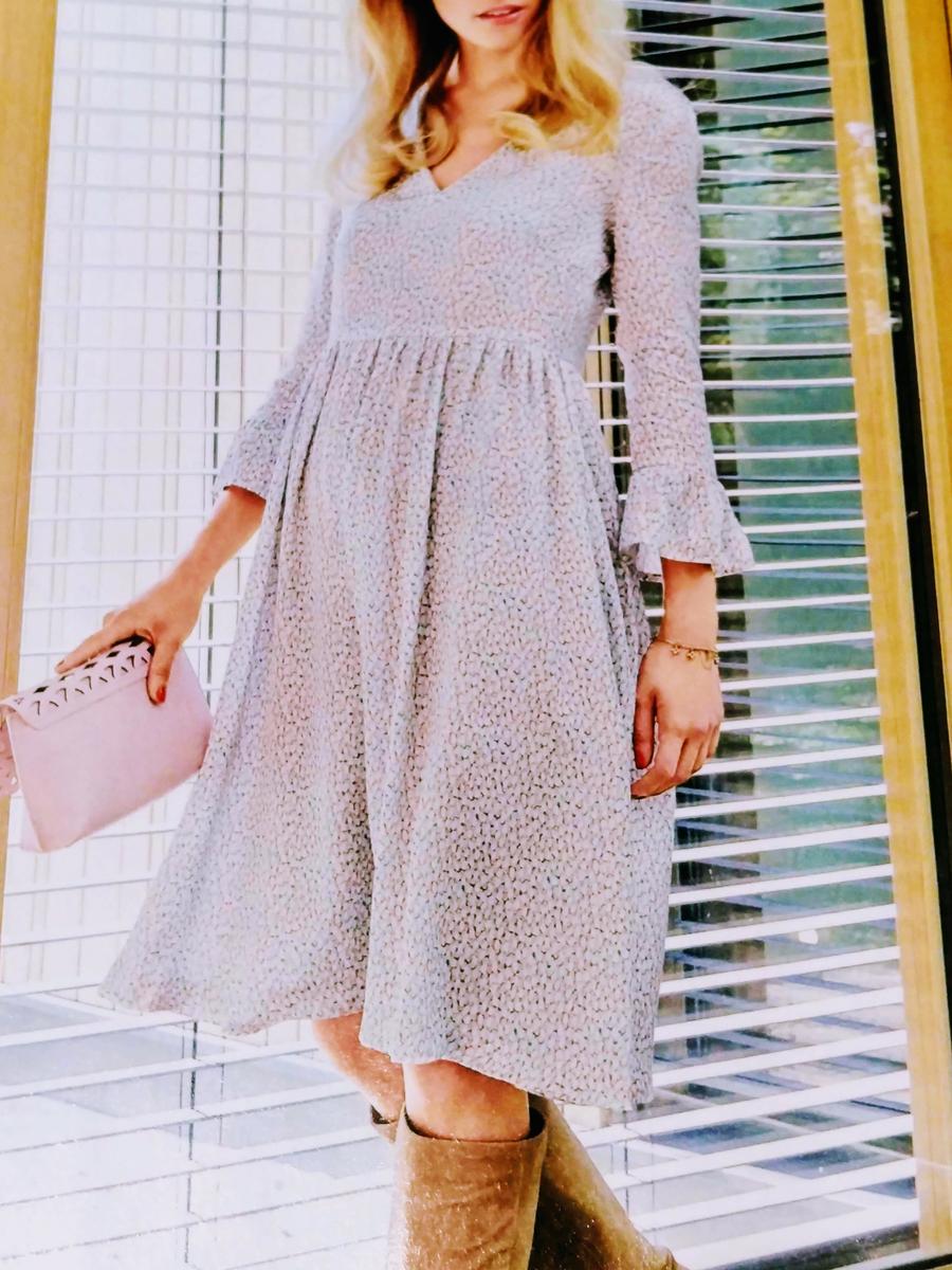 Es un modelo estilo imperio, con corte debajo del pecho, de donde sale una falda fruncida con vuelo. Tiene escote de pico y mangas 3/4 con volante.