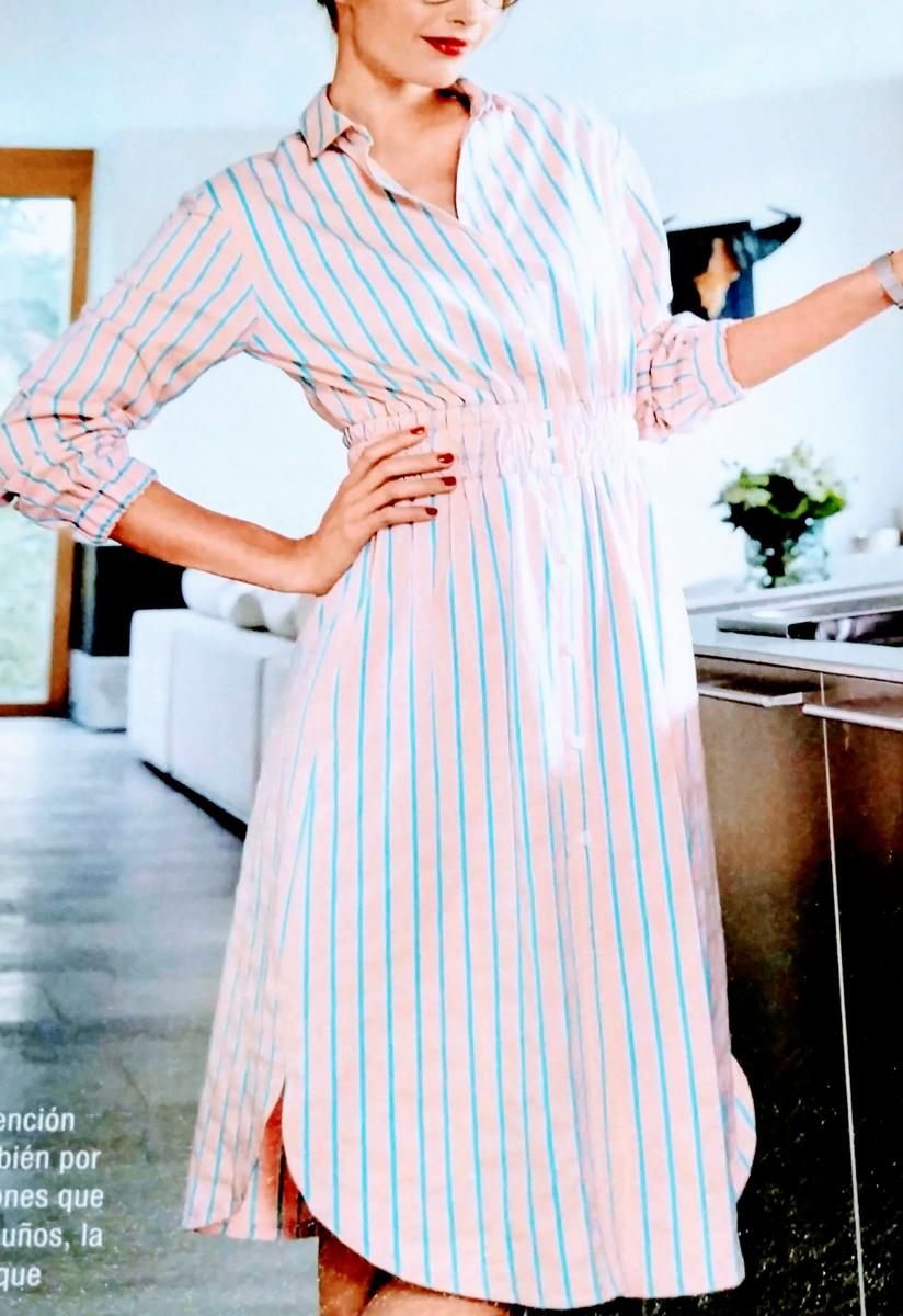 El segundo modelo es un vestido camisero muy cómodo y versátil, con frunce en la cintura y acabado en curva, que puede ser llevado solo o con leggins o vaqueros. Su confección es sencilla si ya hemos cosido alguna camisa, pues la única variación es el frunce en la cintura y las mangas con elástico en vez de puño al uso.