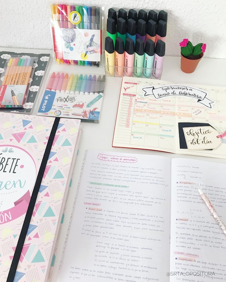 PLANNIFICADOR: ésta es una herramienta esencial para organizarse. Una buena planificación de los objetivos nos va a proporcionar una optimización del tiempo que empleamos para estudiar. Yo uso uno que me compré en Aliexpress y me encanta. Es tamaño A5, fino, de encuadernado cosido y a mes vista con los huecos para rellenar los días del mes. Os dejo el enlace de este planificador aquí.