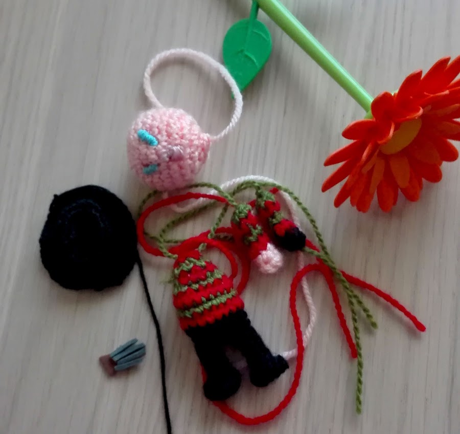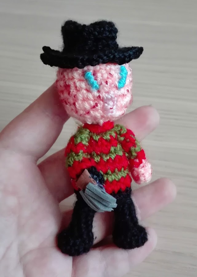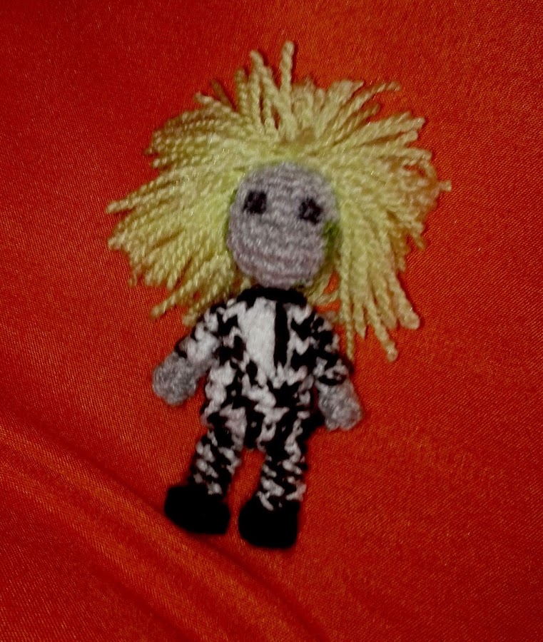 Y ya tenía mi pequeño Freddy! Pero entonces me dije, no sería bonito un mini Beetlejuice?! Y a ello me puse Bastante complicados los cambios de color y más con rallas verticales en una cosita tan pequeña...pero lo conseguí, y aquí os dejo el resultado!