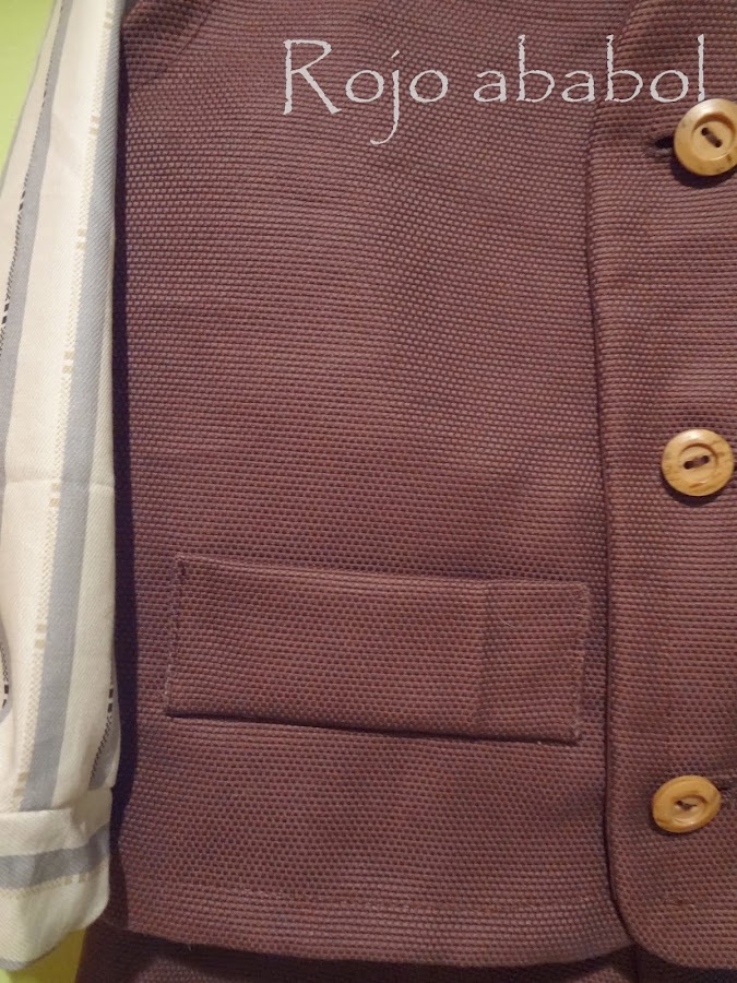 Corte cruzado en el delantero, tapeta simulando bolsillo y botones como los del pantalón. He de agradecer el mérito de tanto ojal, tanto en las camisas como en los chalecos, a mi suegra... todos a mano... Gracias!!