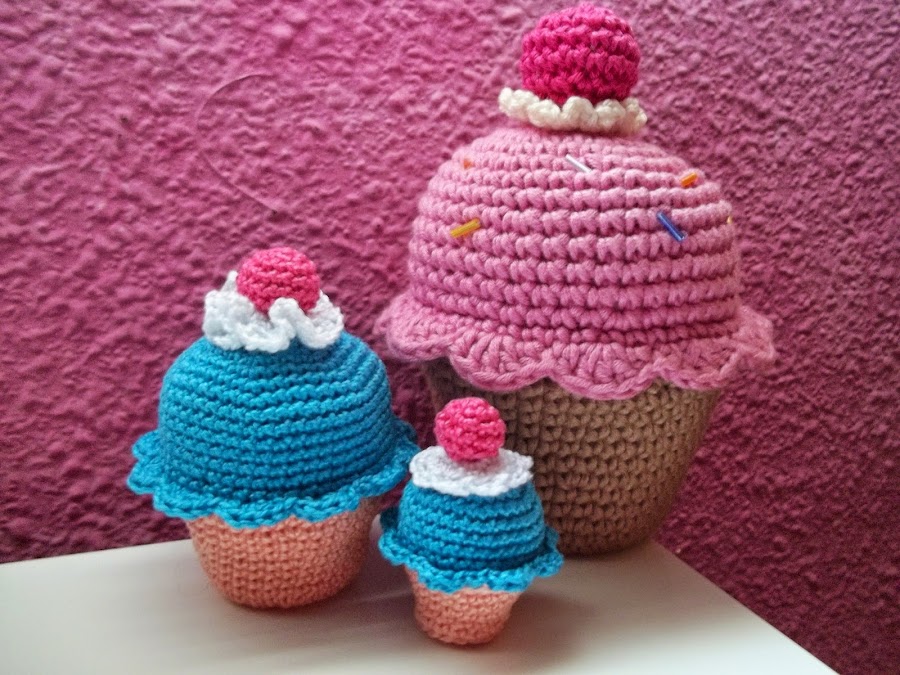 He hecho unas fotografías junto a uno de mis cupcakes clásicos para que veáis la diferencia de tamaño. Los normales miden unos 13 centímetros de alto, y en este caso he tejido dos más pequeñitos, uno de 8 cm y otro de 5 cm.