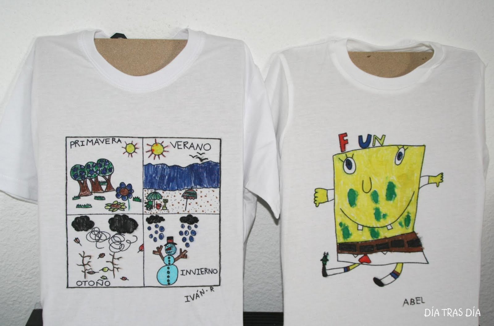DIBUJO DE ABEL RECIÉN COMENZADO MUESTRA EN LA QUE IVÁN HIZO LA PRUEBA DE COLORES MUESTRA EN LA QUE ABEL HIZO LA PRUEBA DE COLORES LAS DOS CAMISETAS TERMINADAS DETALLE DE DIBUJO DE IVÁN TERMINADO DETALLE DE DIBUJO DE ABEL TERMINADO LUCIENDO ORGULLOSOS SUS OBRAS DE ARTE ;-)