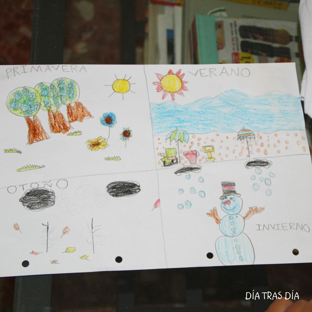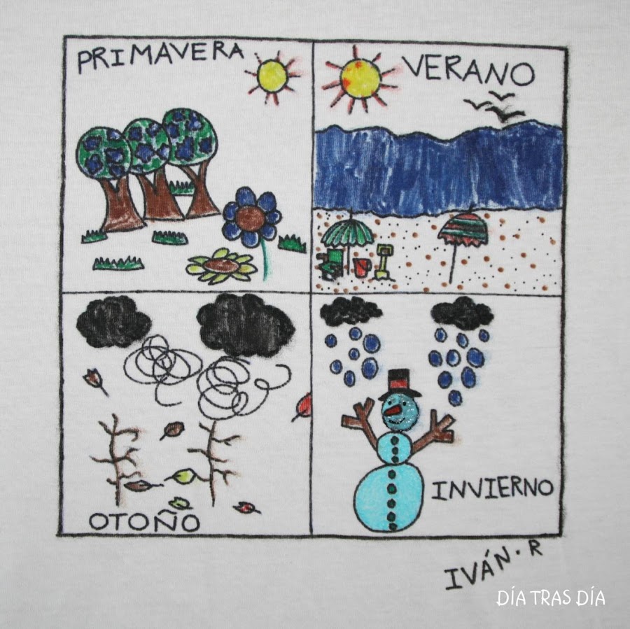 En primer lugar, les dije que se hiciesen en un papel el dibujo que querían dibujar en la camiseta. Y así fue como Iván se hizo su propio diseño que él ha llamado "4 estaciones" y en el que ha hecho 4 viñetas distintas, en cada una de las cuales ha dibujado los elementos más representativos de cada estación.
