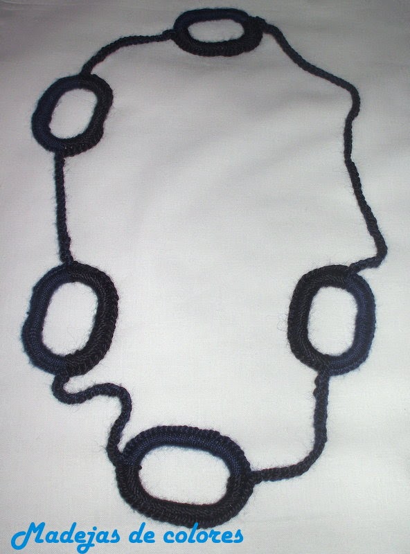 En este collar hice mis pinitos con el ganchillo, reciclando restos de ovillos azules y anillas de cortinas de baño.