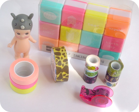 Y un pack de 12 sellos con tintas fluor en color rosa, verde, amarillo y naranja con un montón de frase y dibujos bonitosos que me vienen de perlas para decorar el organizador del blog y mi agenda :)