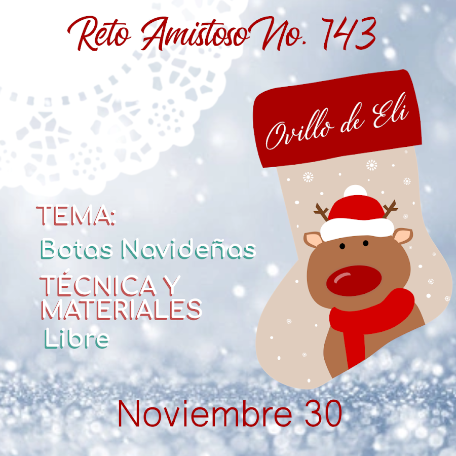 Y para finalizar el mes el Reto Amistoso nº 143 cuya organizadora, Eli, nos ha propuesto el tema "Botas Navideñas", una preparación para lo que nos viene en el próximo mes. Eli es la propietaria del blog Ovillo de Eli, donde podréis ver las bases de este entrañable reto. El día para presentar nuestros trabajos es el 30 de noviembre a las 9 de la mañana, hora española.