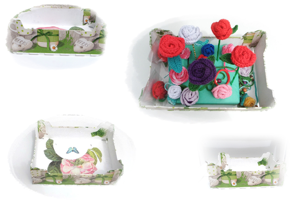 Como quería llevarlas en alguna caja bonita, aproveché una caja de fresas que tenía para volver a probar con la técnica de decoupage, y realmente me gusta mucho el resultado.