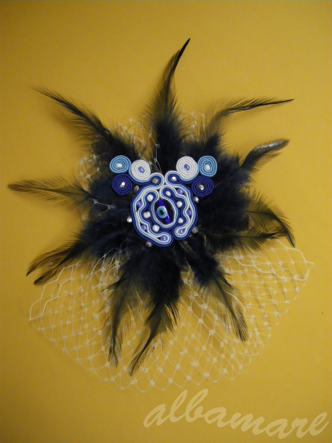Ya que a todo el mundo no le gusta llevar un gran tocado, hoy os muestro un pequeño detalle como tocado. Está hecho con cinta soutache y abalorios, aparte de plumas y del típico tapafeas.