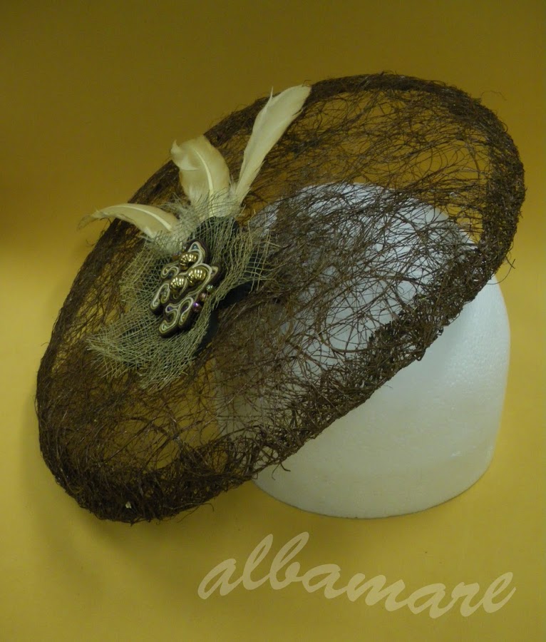 And this one is the last headdress I made in my course. It"s brown, embellished with a flower and sinamay, feathers, southache and beads.