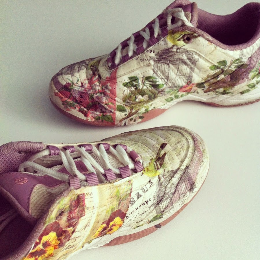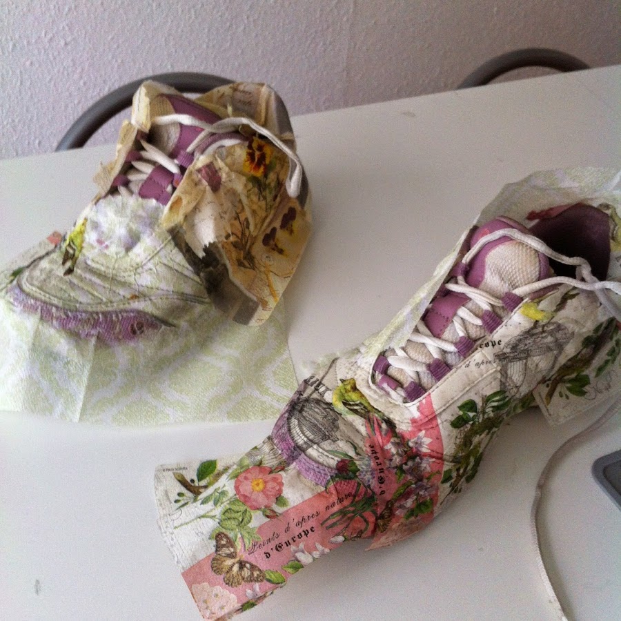Vamos dando barniz a la zapatilla y poniendo las servilletas como se quiera. He utilizado barniz satinado especial para papel y/o servilletas. http://www.adacartonnage.com/tienda/materiales/