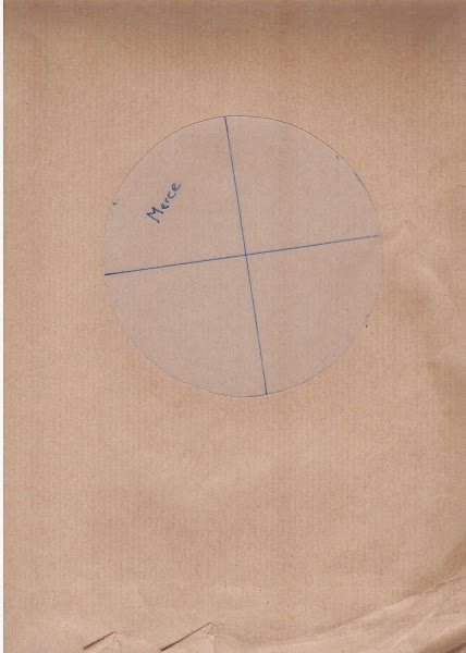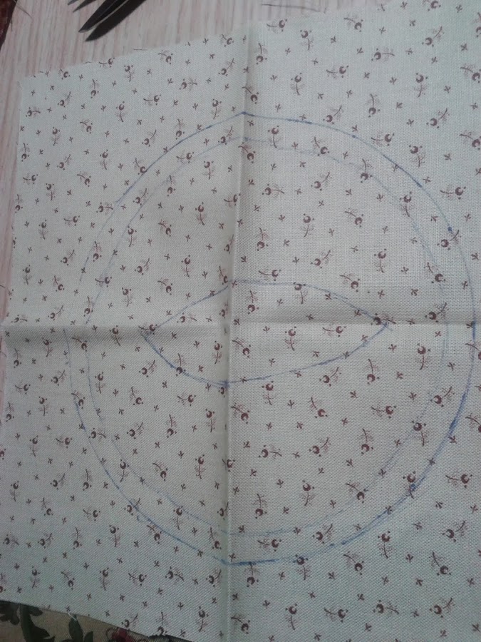 Cada cuadro se dobla por la mita dos veces para marcar el medio. Se pone el circulo de 12,5 de diametro y se marca y se marca otra circunferencia interior.