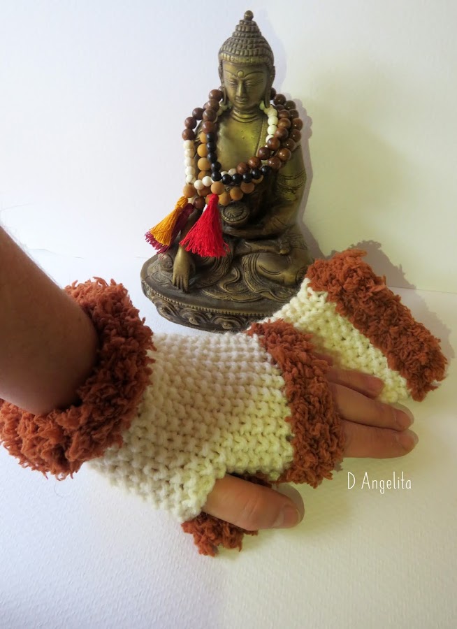 Hola!! hoy os dejo unos mitones que realicé en mi último tutorial. Puedes tejerlo con lana de pelito, o bien ésta que simula coo borreguito, cambiar colores, hacerlos más largos... Se tejen en un plis ...