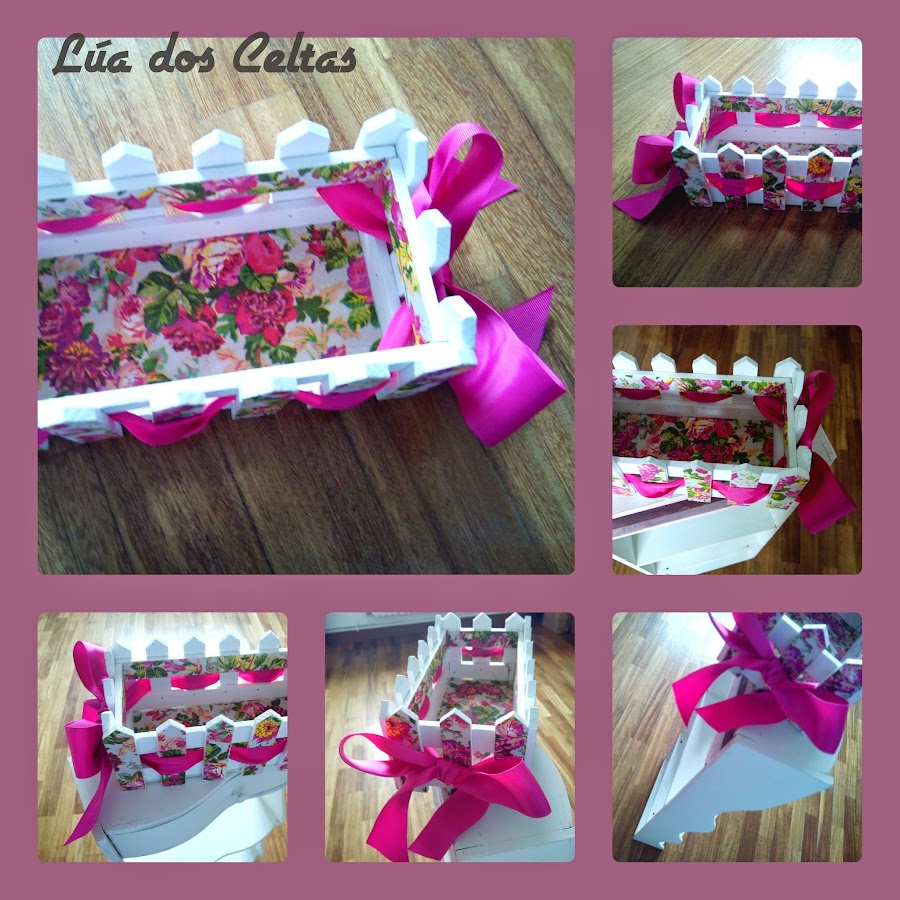 Me encanta esta cajita a modo de verja...ya venía en blanco así que no tuve que pintarla...tenía un rollo de lazo rosa, así que opté por darle este acabado infantil, cursi pero vistoso! ;-)