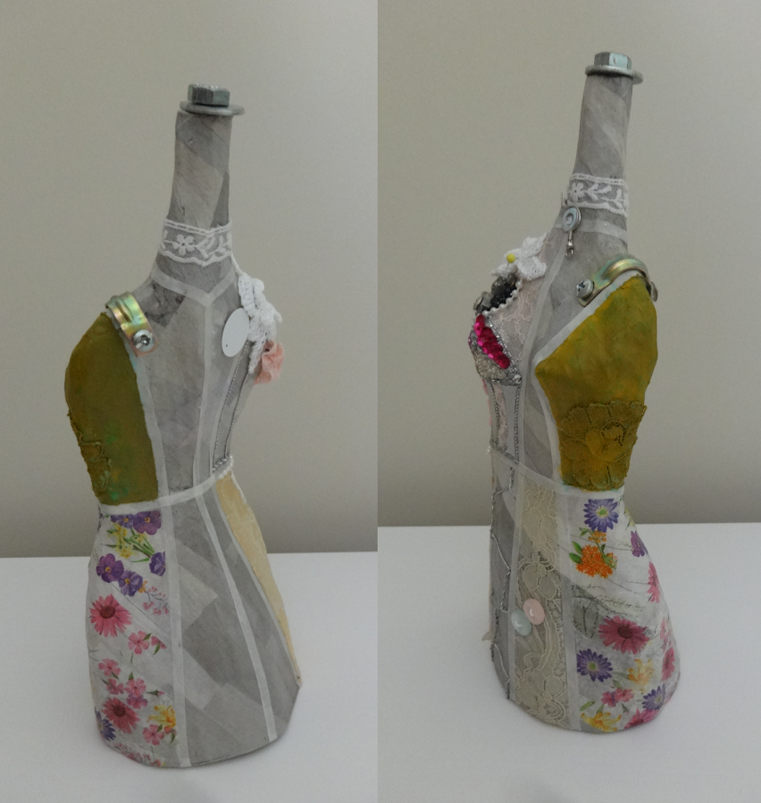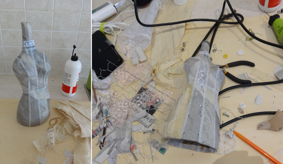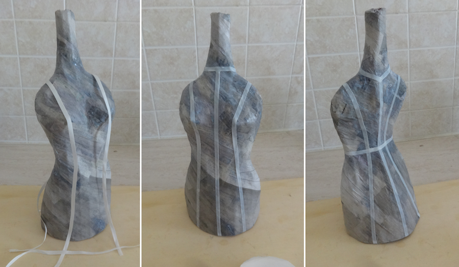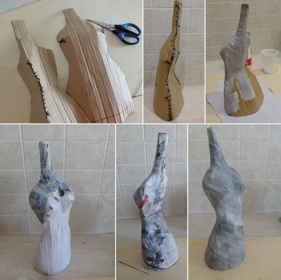Como primer paso construí el maniquí en dos piezas de cartón cosidos entre si, luego apliqué varias capas de papel periódico con pegamento blanco y agua en proporciones iguales. Cuando obtuve el resultado deseado pase una capa final de papel periódico en diagonal