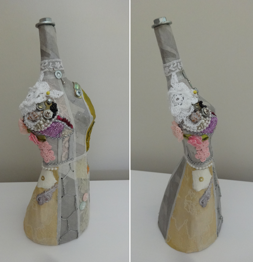 Fui acomodando los elementos y pegándolos poco a poco, no seguí ningún patrón si no aquello que poco a poco se fue construyendo, ya no podía parar, delineé por ejemplo la copa del busto y cada sección la rellené con chaquiras, lentejuelas y glitter, acomodé flores de ganchillo que ya había realizado con anterioridad