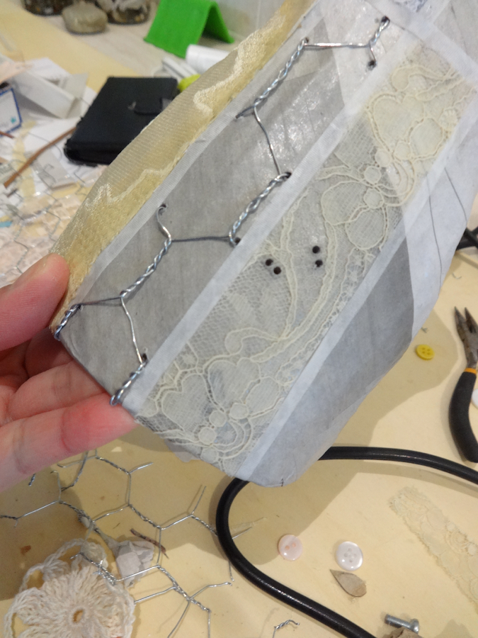 Intercale las secciones para que cada una tuviera una textura diversa, tul, encaje, jacquard, papel de china, oleo, conchas de mar, pasamanería, etc. El oleo no fue una buena idea, pero ya no pude corregir
