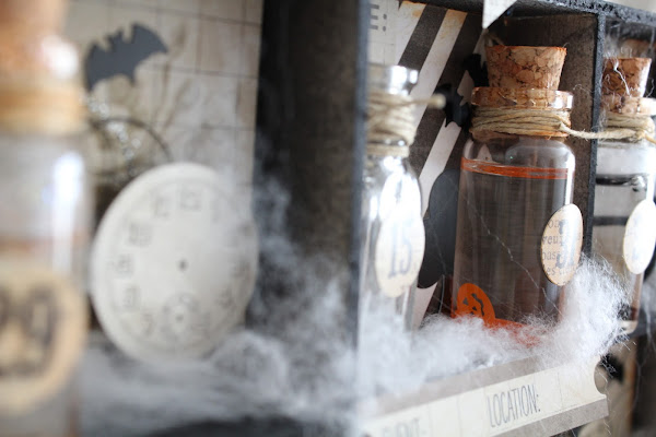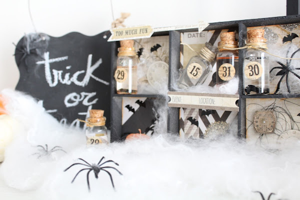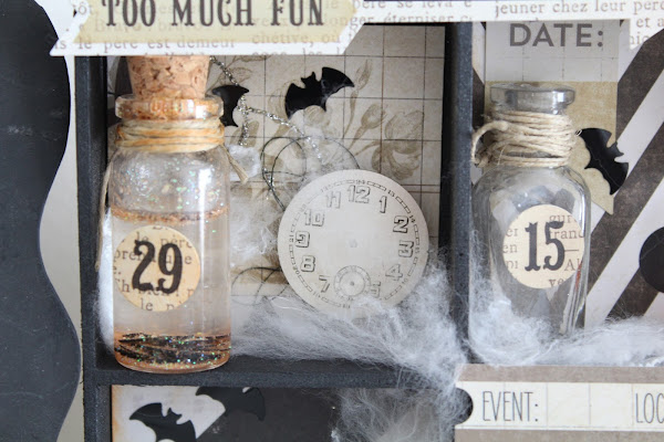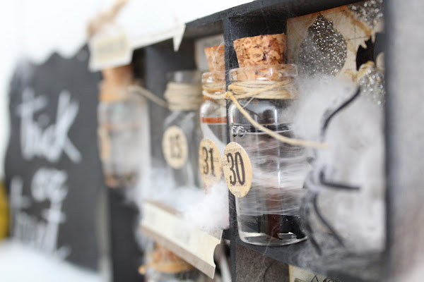 El toque terrorífico lo dan las Botellitas de Pócima, son botellitas que encontrareis en cualquier tienda de todo a 100, las he rellenado de glicerina y les he añadido purpurina, mini calabacitas y murciélagos. También podéis pintarlas con técnicas Mix Media, yo les he añadido un cordel que he envejecido y unos stickers, pero podéis poner Pan de Plata o de Oro, o incluso pintura por dentro para simular liquido.