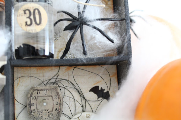 He ido rellenando los compartimentos con papeles decorados y les he añadido diferentes elementos que tenia por casa, he pintado los bordes con tinta Distress y algunos hilos para añadir textura.