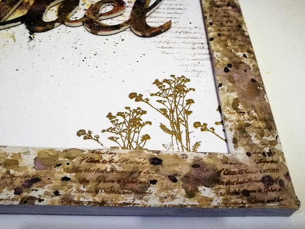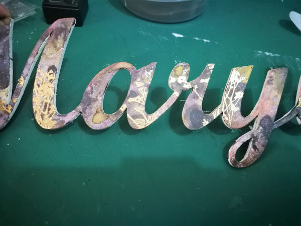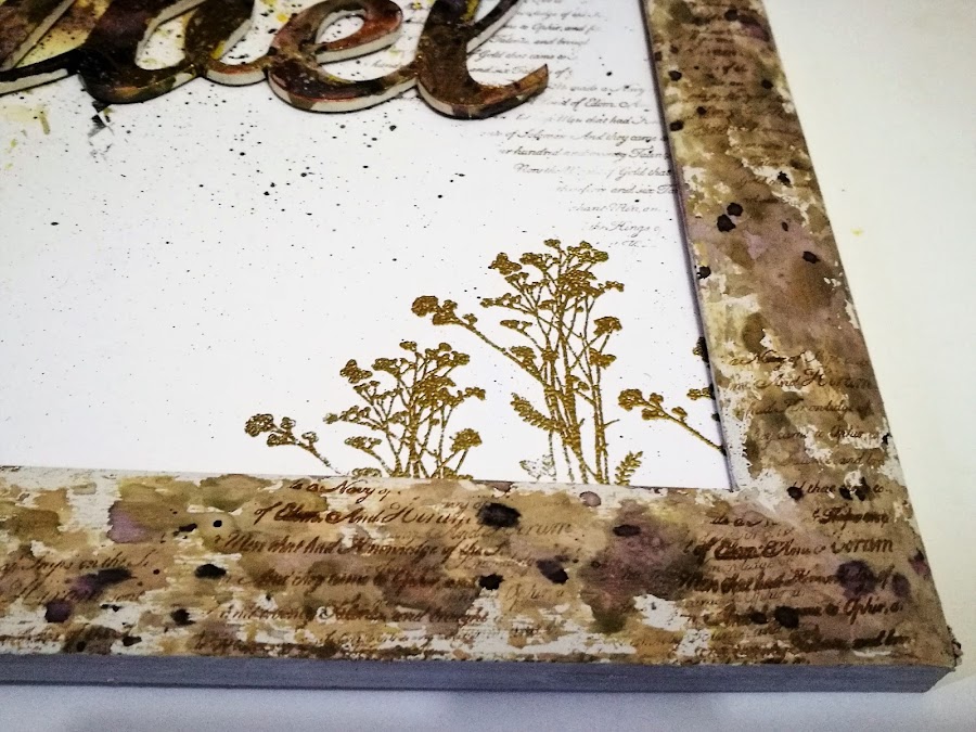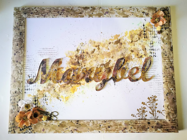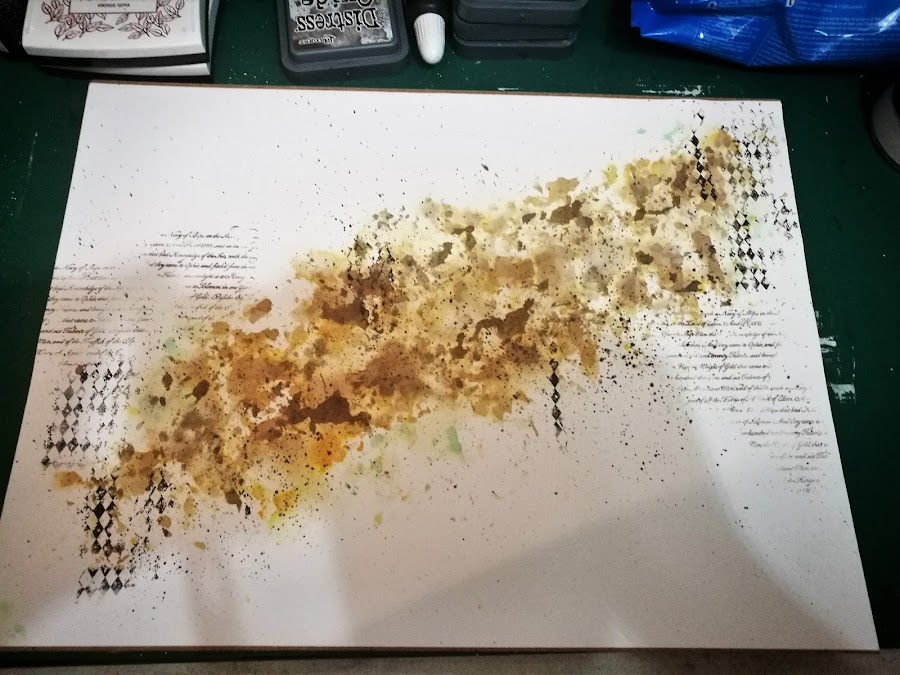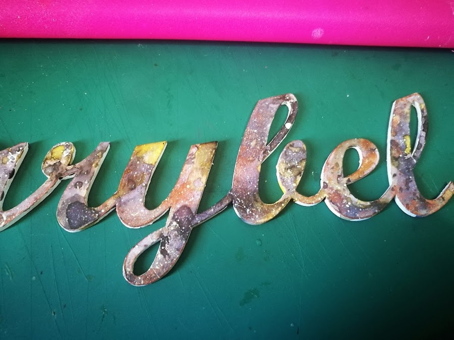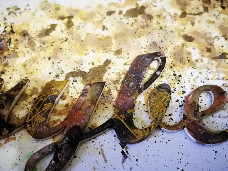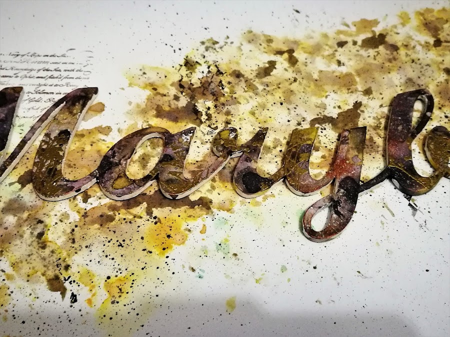 en un plástico de base, puse dylusion ground coffee y black marble, y acuarela líquida Vallejo (ya que no tengo ningún spray mas que le fuera a la gama de colores que quería para mi proyecto) en colores amarillo ocre y marron intenso y fui manchando el nombre