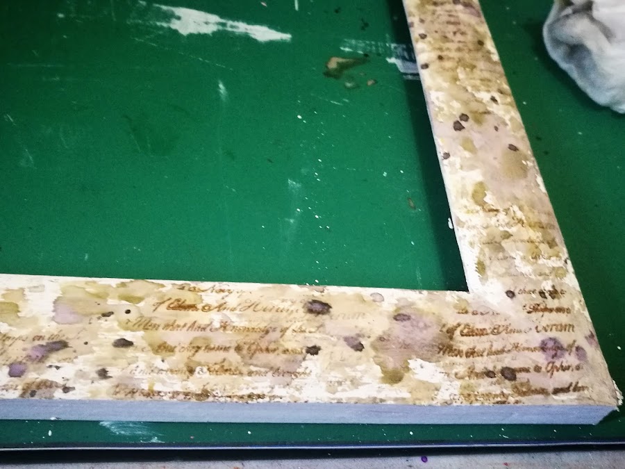 ya era hora de montar el fondo con el marco, y al hacerlo, no me gustó como quedaba el blanco, así que también guarreé el marco con la misma técnica y colores que el fondo