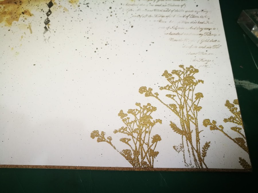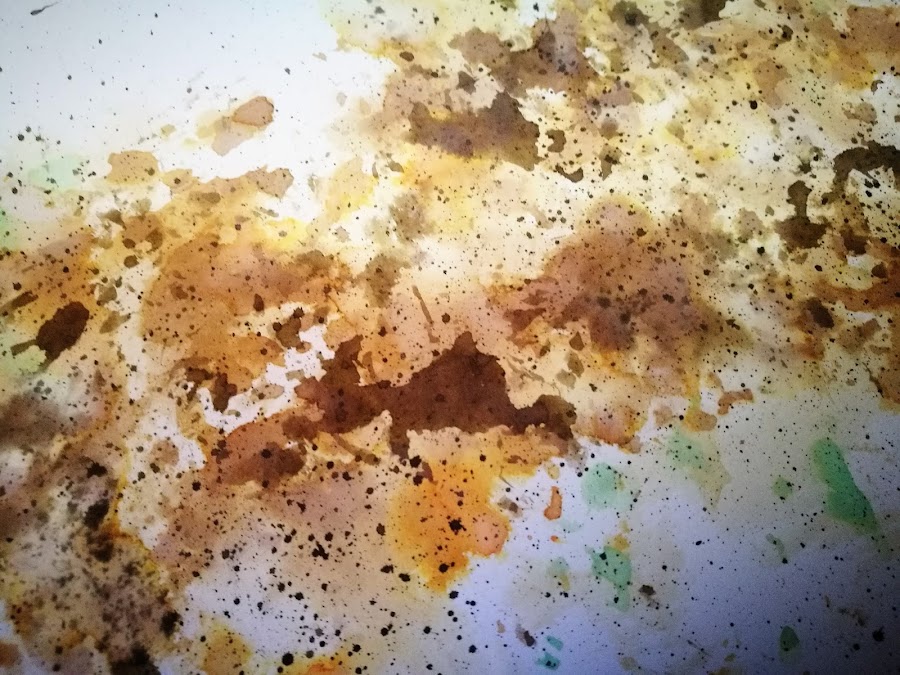 y después le añadí unas salpicaduras con dylusions ground coffee y black marble. âra acabar, stampé un par de sellos de fondo