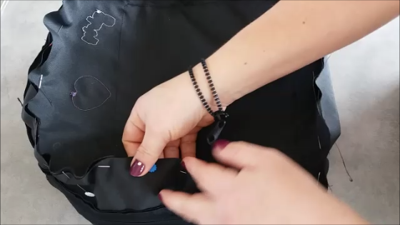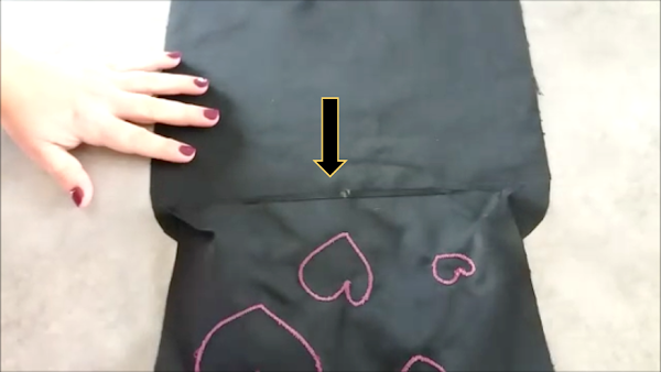 Entonces, colocamos en bolsillo con el derecho hacia abajo, a 4 cm del borde inferior de la tela de la mochila y cosemos dejando unos centímetros sin coser en cada extremo, de ésta forma: