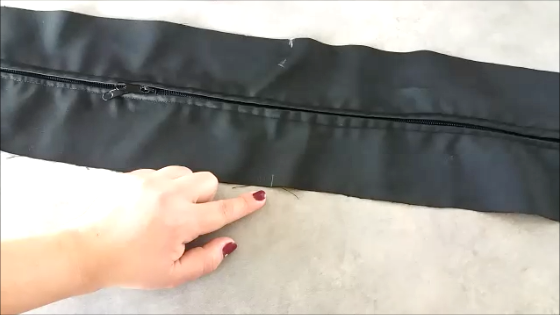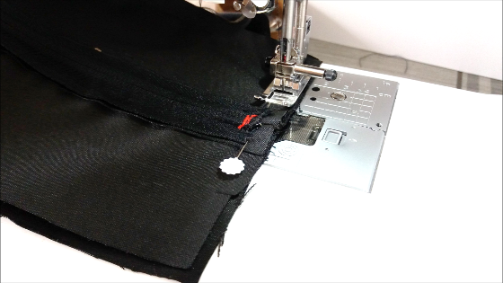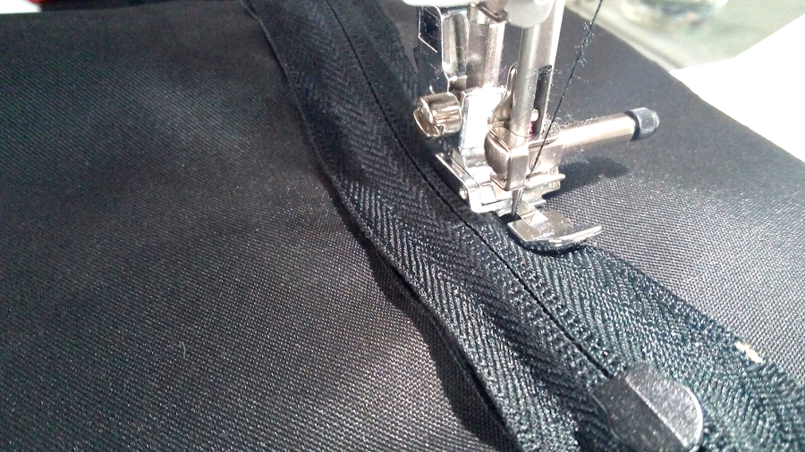 Hecho esto, abrimos la costura y la planchamos. Luego ponemos encima la cremallera con el derecho de la misma (carro y dientes) hacia abajo; y cosemos alrededor rematando en los extremos, de manera que la parte del derecho de la cremallera quede oculta.