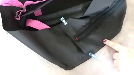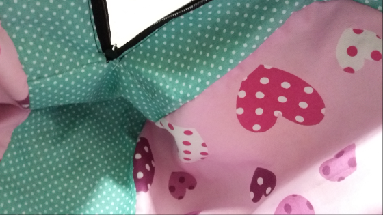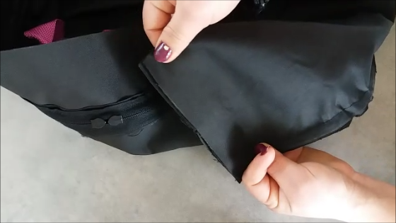 Ahora vamos a cerrar la abertura que nos ha quedado, colocando la tela de abajo de la mochila en el borde y justo encima, la pieza de la cremallera, así:
