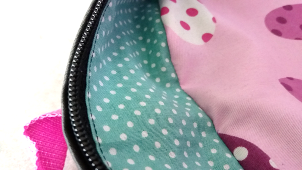 Metemos entonces la mochila que debe estar del revés, dentro del forro que debe estar del derecho, ponemos el forro al borde de la cremallera y lo arreglamos y sujetamos con alfileres o con un hilvanado, y cosemos.