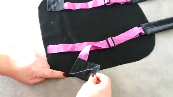 Hecho esto, ponemos el asa superior usando unos 10 cm cinta, y justo a los lados las asas de la espalda ligeramente inclinadas, y cosemos.