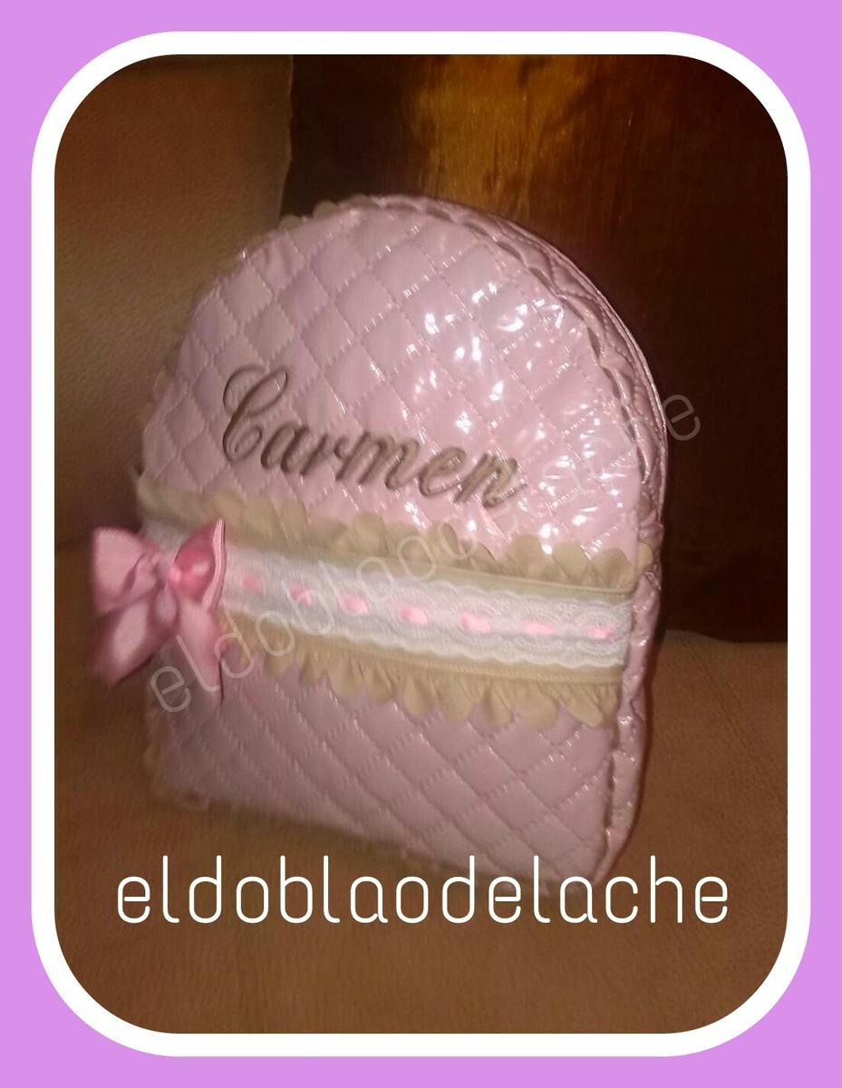 Mochila de color blanco con adornos rosa en tela acolchada y nombre bordado que se va para Dos Hermanas. Muchas gracias Omaira