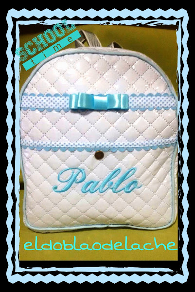 En tela plastificada blanca y adornos celeste. Lleva bolsillo frontal.