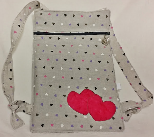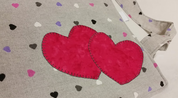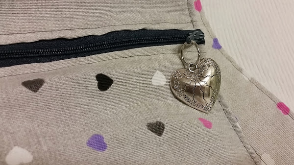 Se trata de una pieza que hemos hecho con una tela de corazones chiquititos, pero en la que además hemos aplicado unos corazones más grandes y en la cremallera también hemos puesto un charm, por supuesto, con forma de corazón.