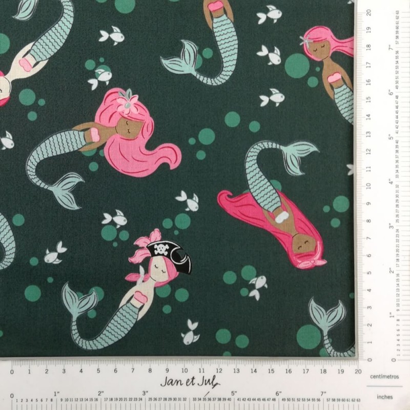 Main Ocean es una bonita tela con la que podrás hacer proyectos marineros para tod@s: toallas, bolsas, mochilas una tela preciosa con sirenas de Riley Blake, una tela de algodón americano verde oscuro con sirenas en tonos rosados de estilo moderno y actual, a continuación la puedes ver en detalle: