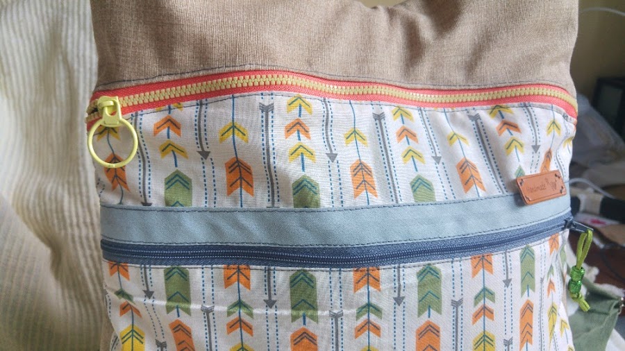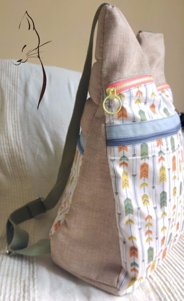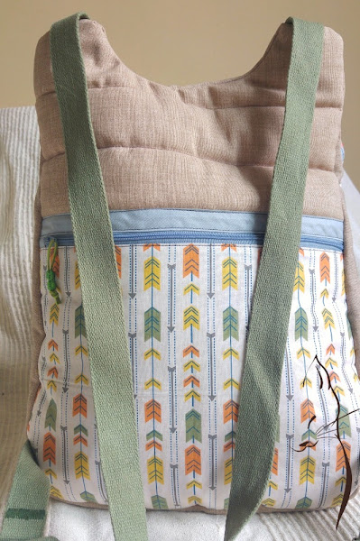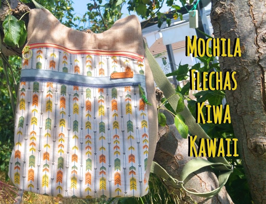 La tela elegida, un algodón con estampado de flechas, combinada con una loneta jaspeada, de estas que me tienen enamorada por el precioso efecto que hacen, ambas de Cal Joan.