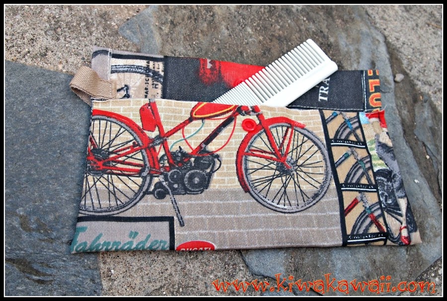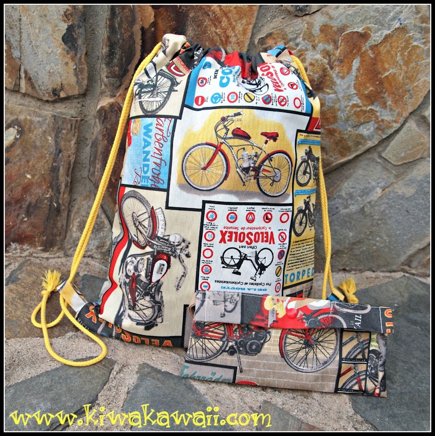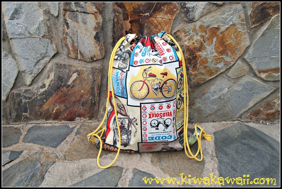 Sencilla al máximo, una simple bolsa de tela plastificada (tipo hule) con estampado de motos, ya la compré en su día pensando en él!