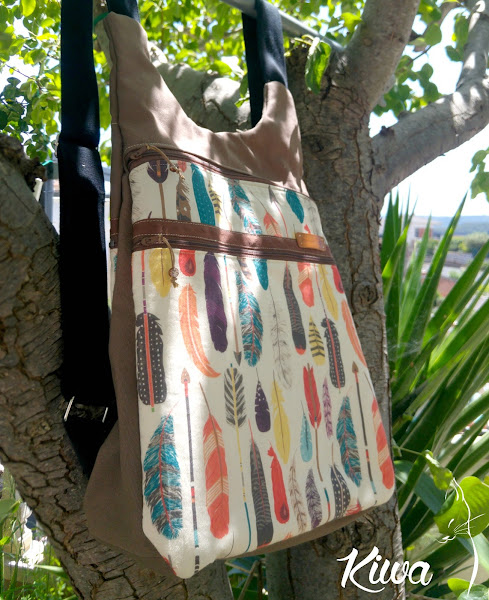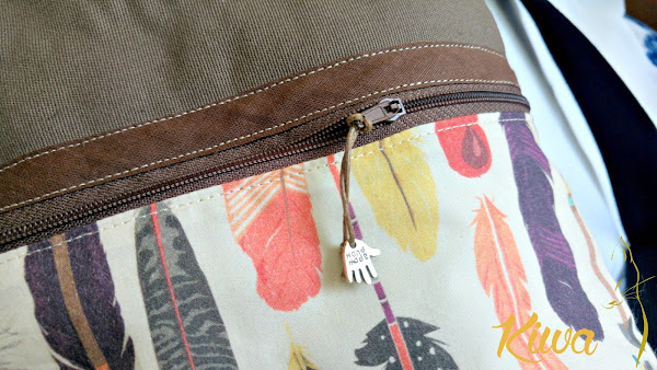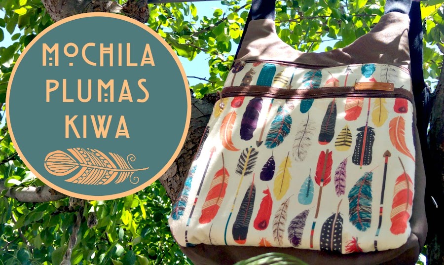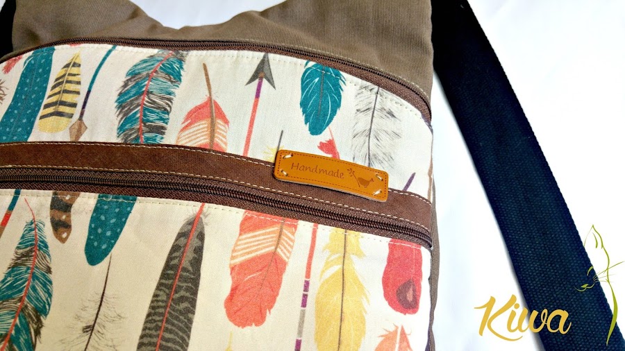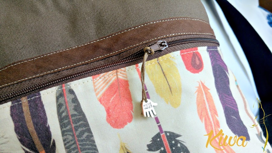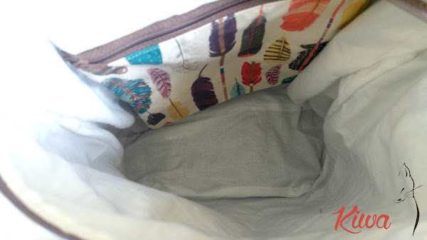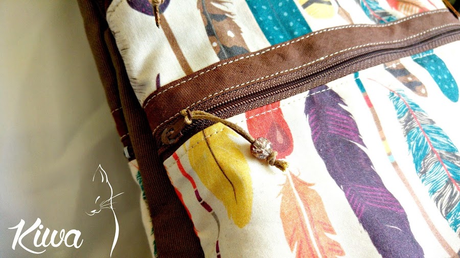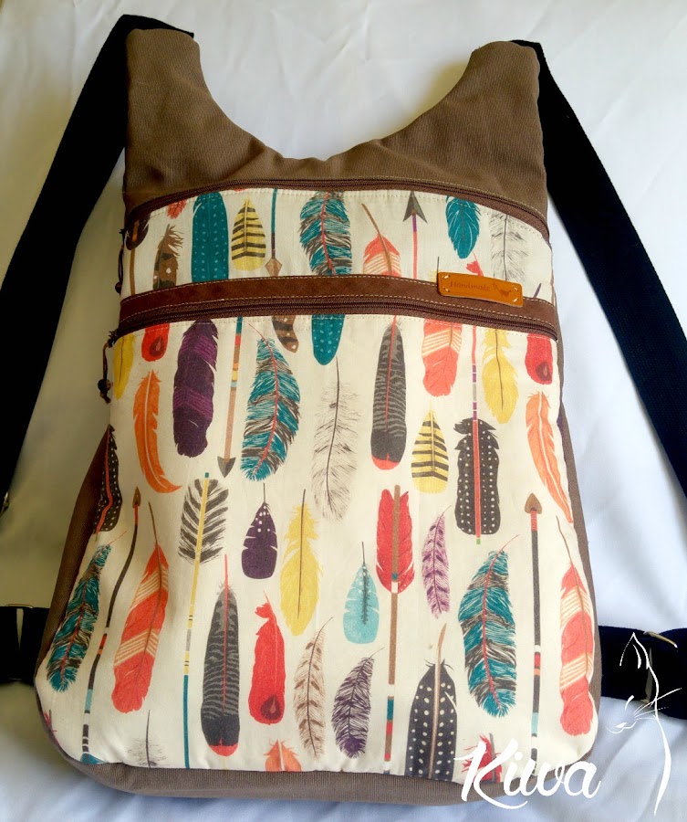 La tela principal, con estampado de plumas es un popelín de algodón muy suave, me encanta trabajar con esta tela! Combinada con una loneta marrón, que le aporta fuerza. Toda la mochila va acolchada y forrada.