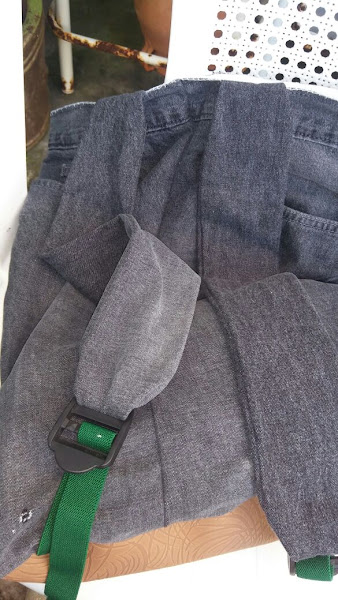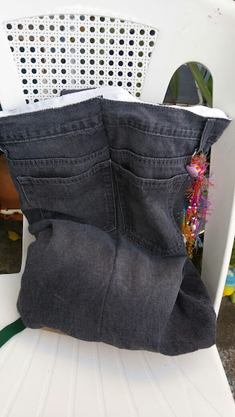 Yo intenté algo similar con un pantalón talla 38 de hombre, y me ha quedado una bolsa como para carga un niño, pero como nada se pierde la usaré para llevar las toallas a la alberca cuando vamos con los niños, le cabe un mundo.